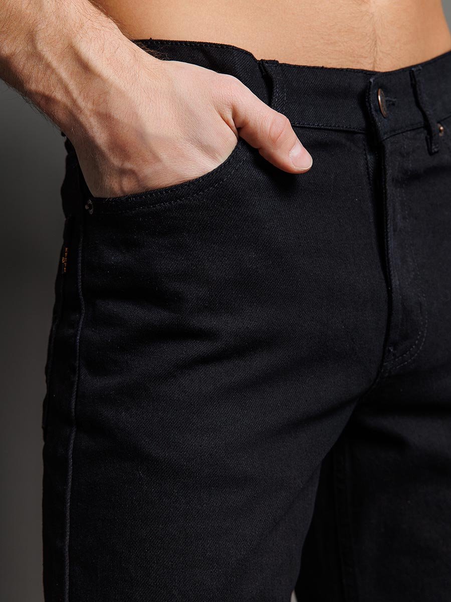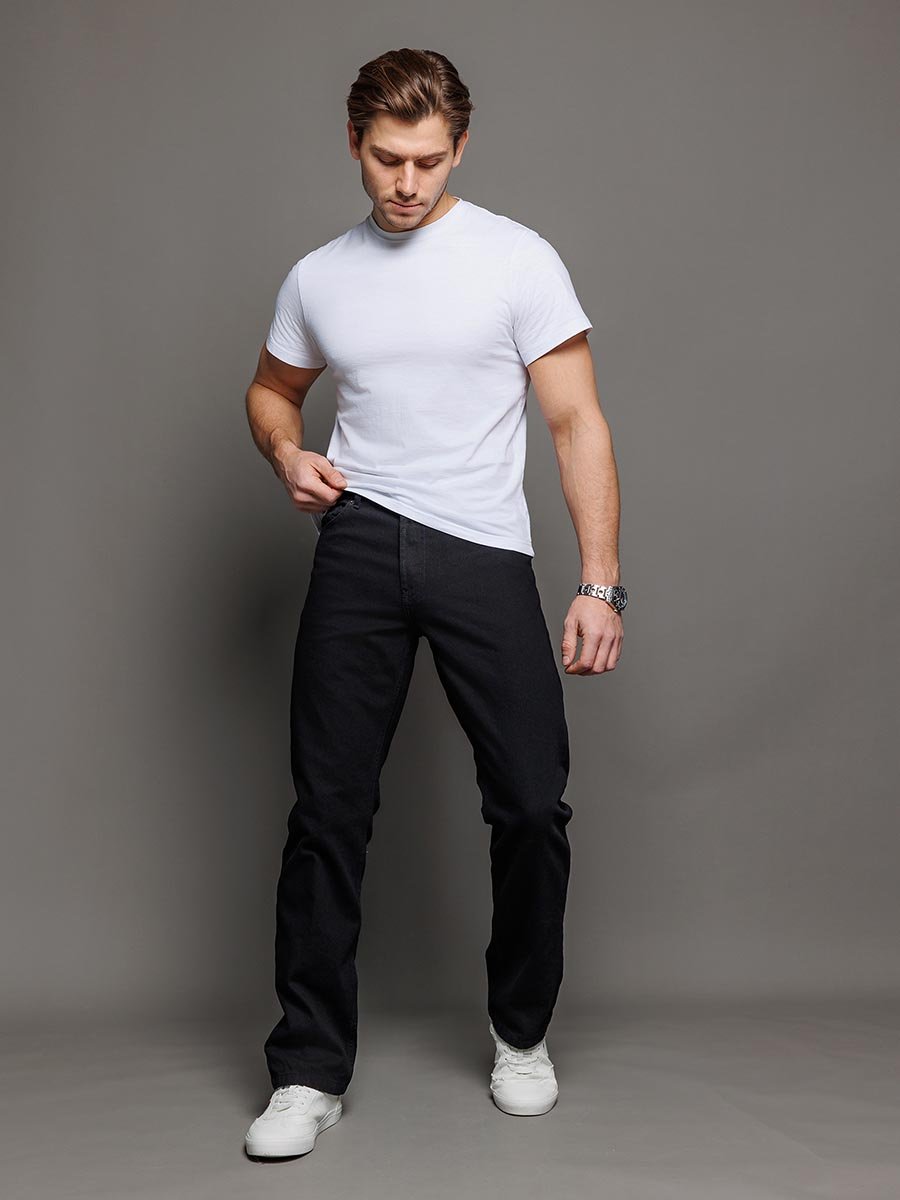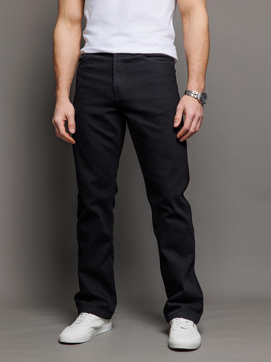 Мужские классические джинсы с пятью карманами. Посадка Regular fit (полуоблегающие по бедру), высокая талия. Застежка на молнии. Немного заужены в колене и по низу. Выполнены из традиционной хлопковой ткани denim, цвет ткани Black/Black (лицевая и изнаночная стороны ткани черные). Специальная темная стирка без потёртостей.