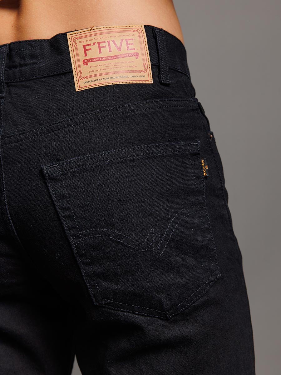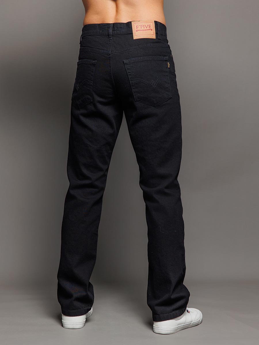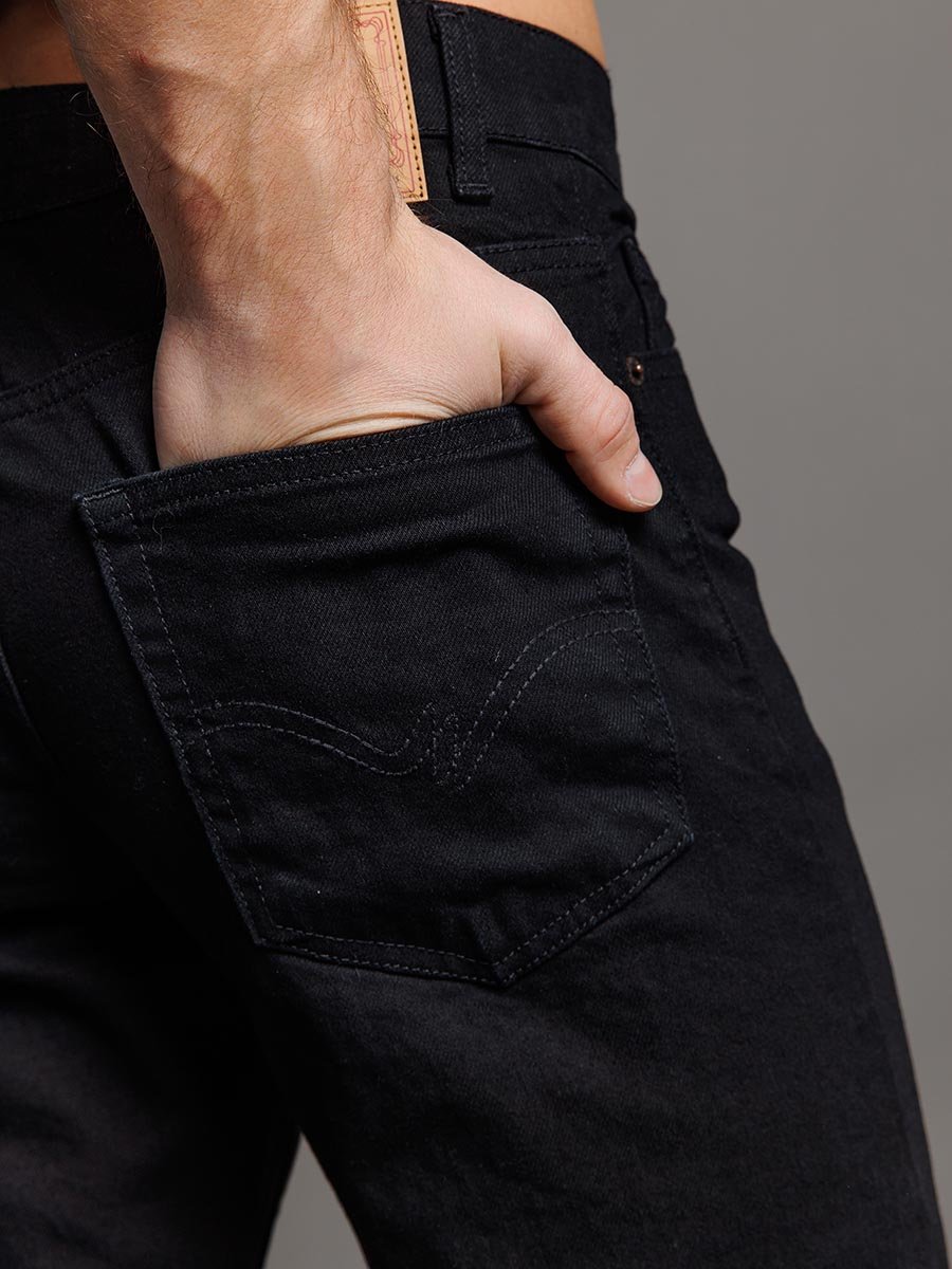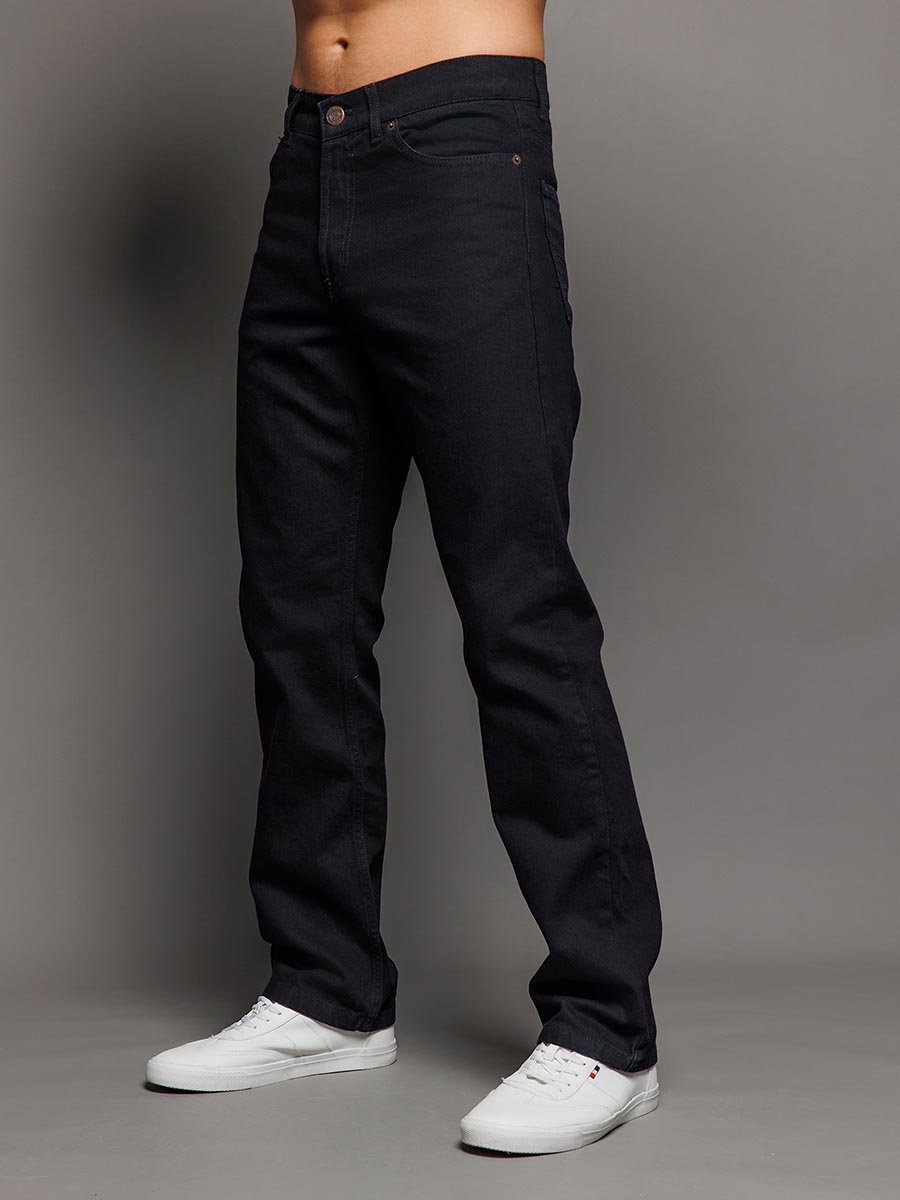 Мужские классические джинсы с пятью карманами. Посадка Regular fit (полуоблегающие по бедру), высокая талия. Застежка на молнии. Немного заужены в колене и по низу. Выполнены из традиционной хлопковой ткани denim, цвет ткани Black/Black (лицевая и изнаночная стороны ткани черные). Специальная темная стирка без потёртостей.
