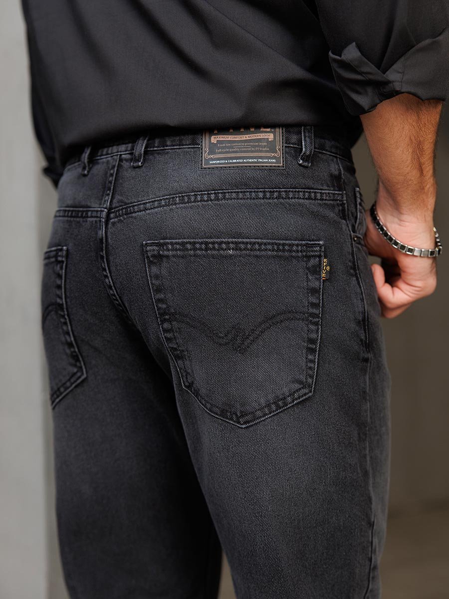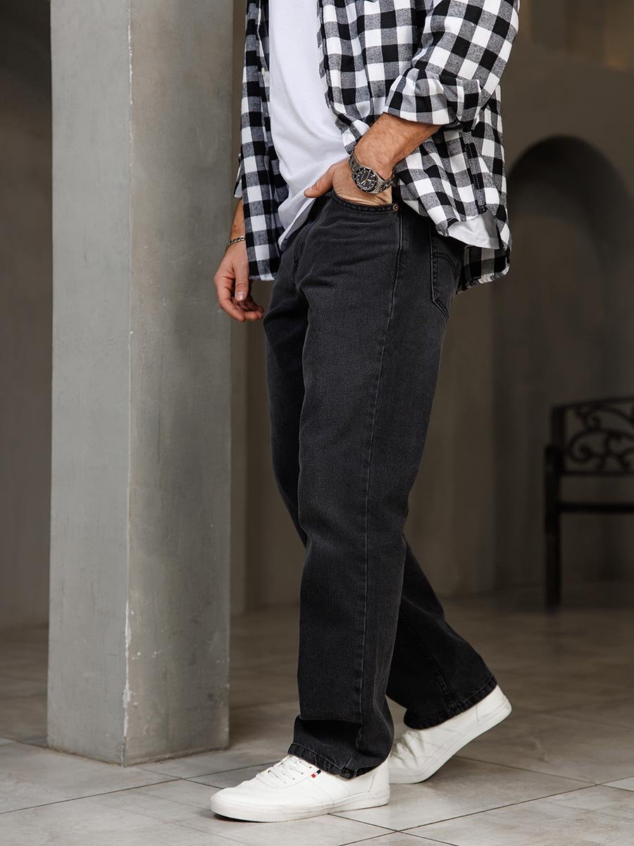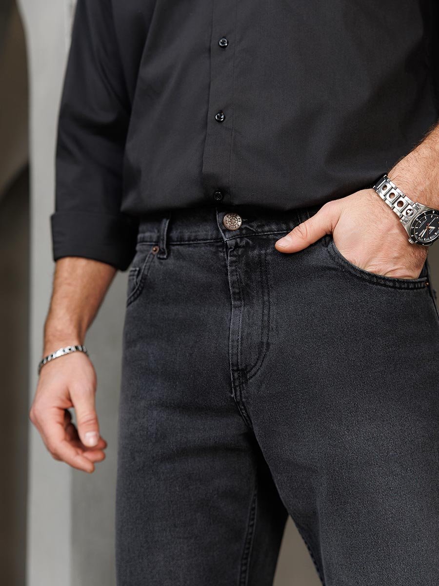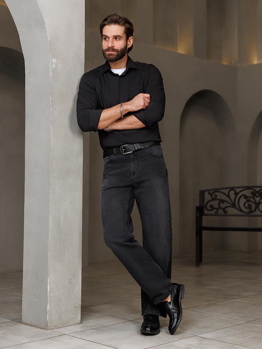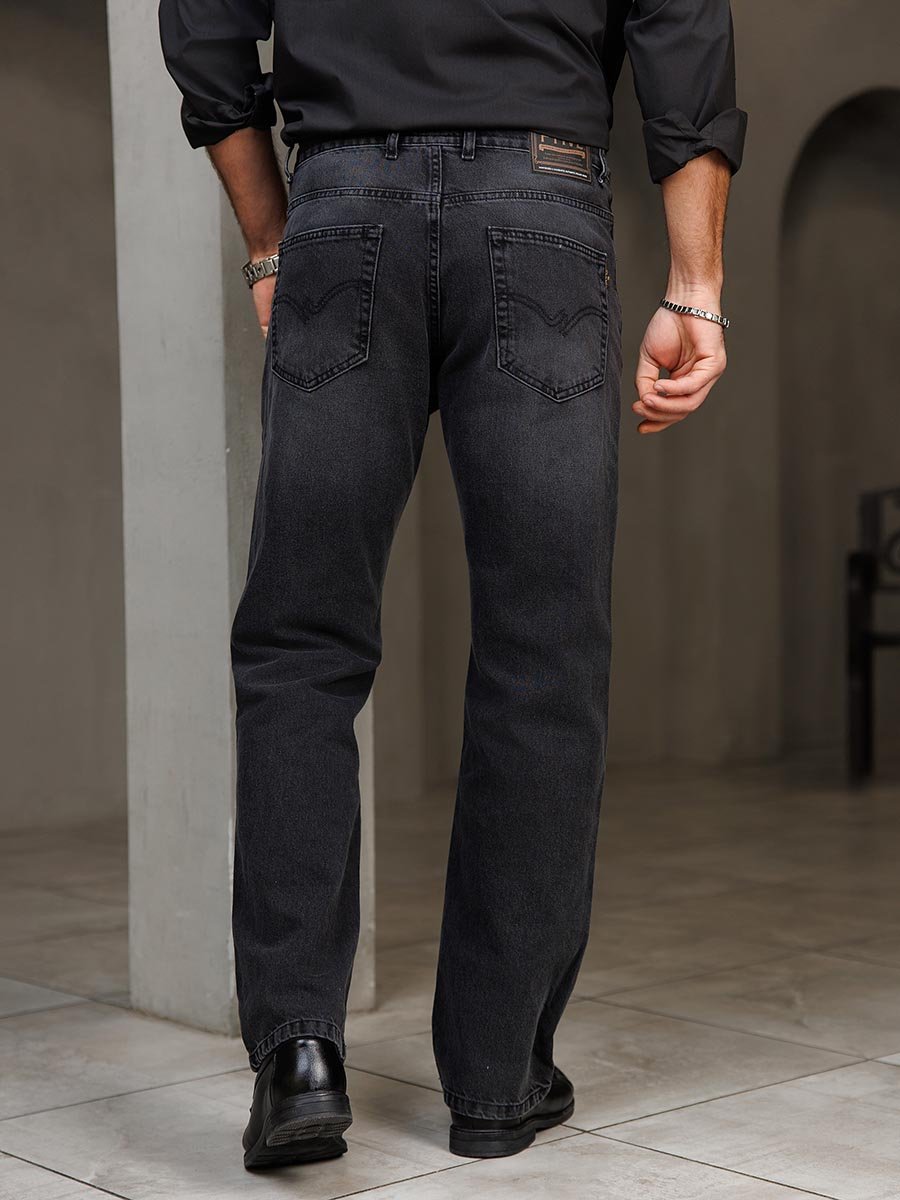 Мужские классические джинсы с пятью карманами. Посадка Comfort fit (свободные по бедру), широкие в колене и по низу, высокая талия. Застежка на молнии. Выполнены из ткани denim, цвет ткани Black/Black (лицевая и изнаночная стороны ткани черные). Классическая темная стирка с потёртостями и спереди и сзади. Параметры указаны для размера 32. Длина внутреннего шва для роста 32 - 81см., для роста 34 - 86см.,,для роста 36 - 91см..