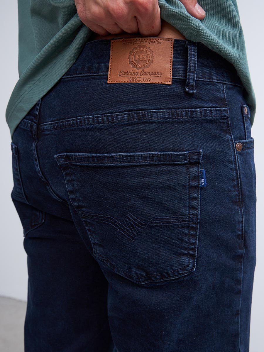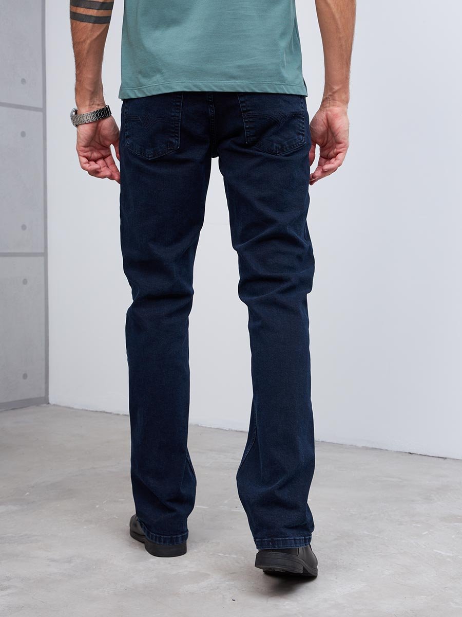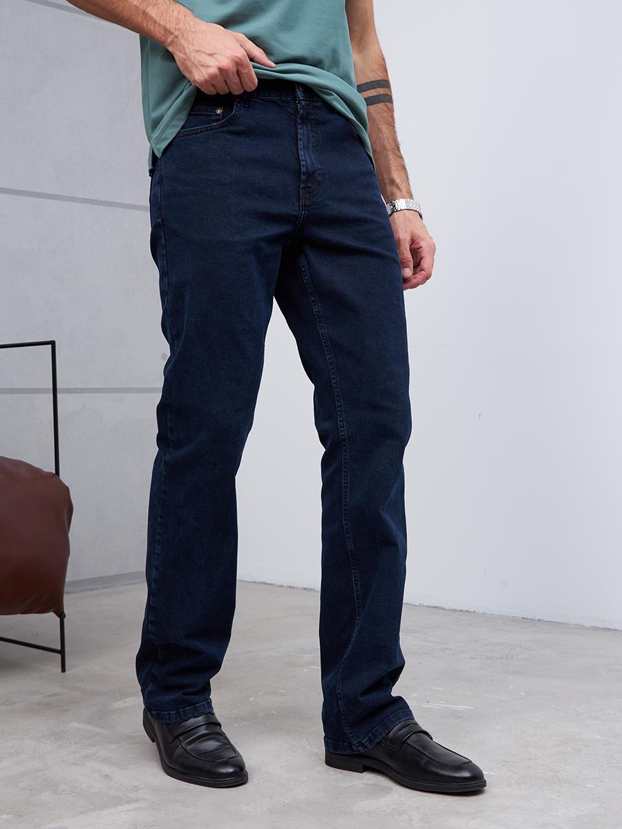 Мужские классические джинсы с пятью карманами. Посадка Regular fit (полуоблегающие по бедру), высокая талия, немного заужены к низу. Застежка на молнии. Выполнены из эластичной ткани denim stretch, цвет ткани Blue/Black (лицевая сторона ткани темно-синяя, изнаночная сторона- черная). Темная стирка со потёртостями только по швам.