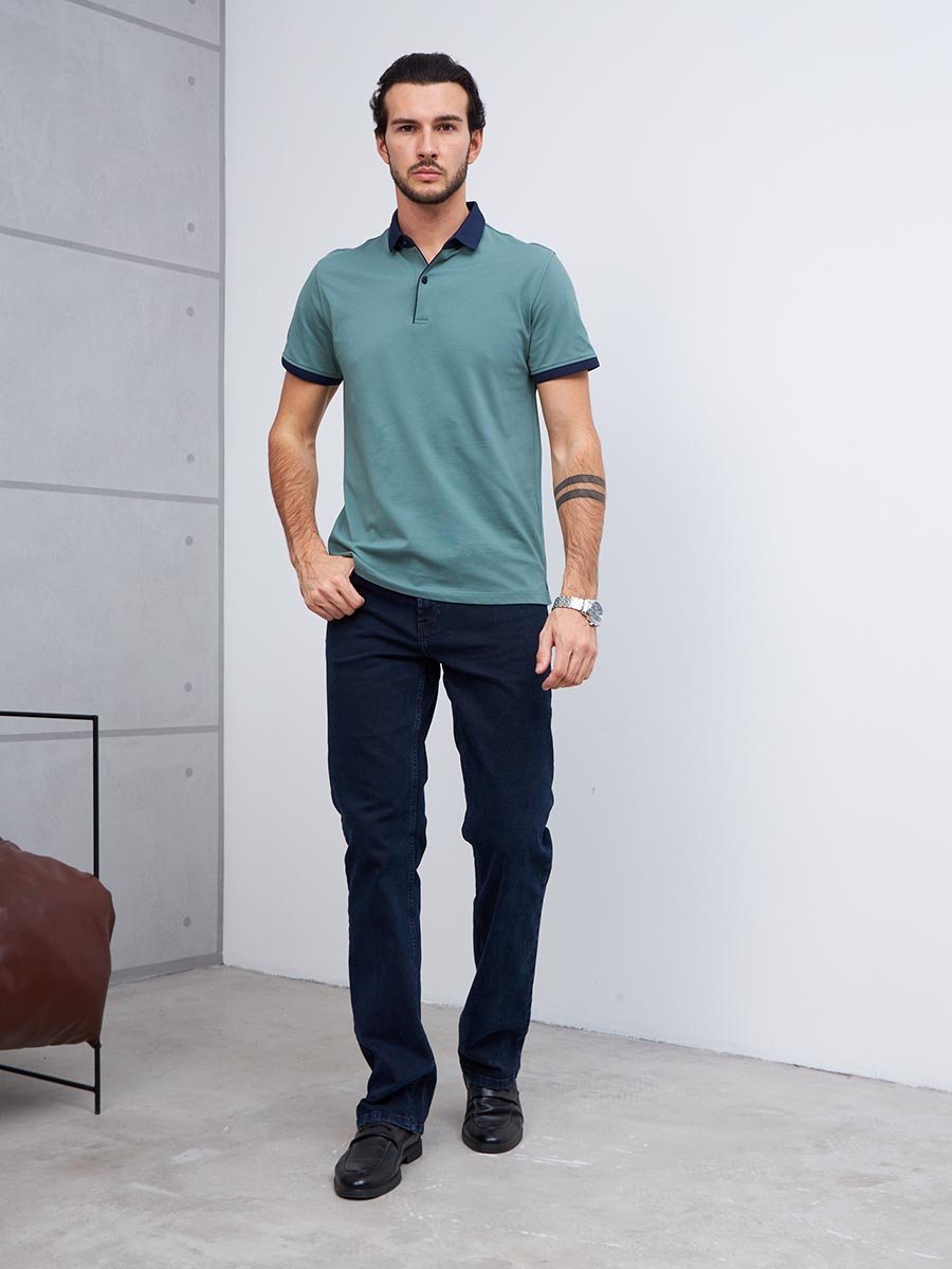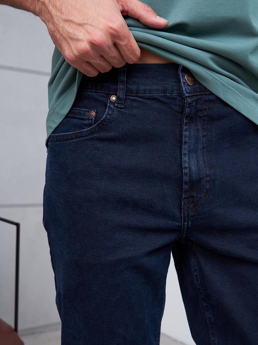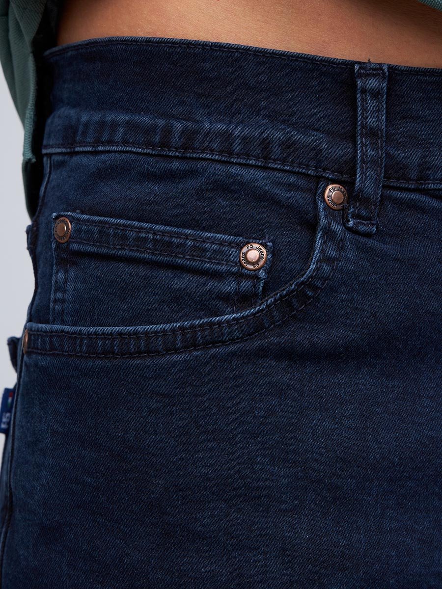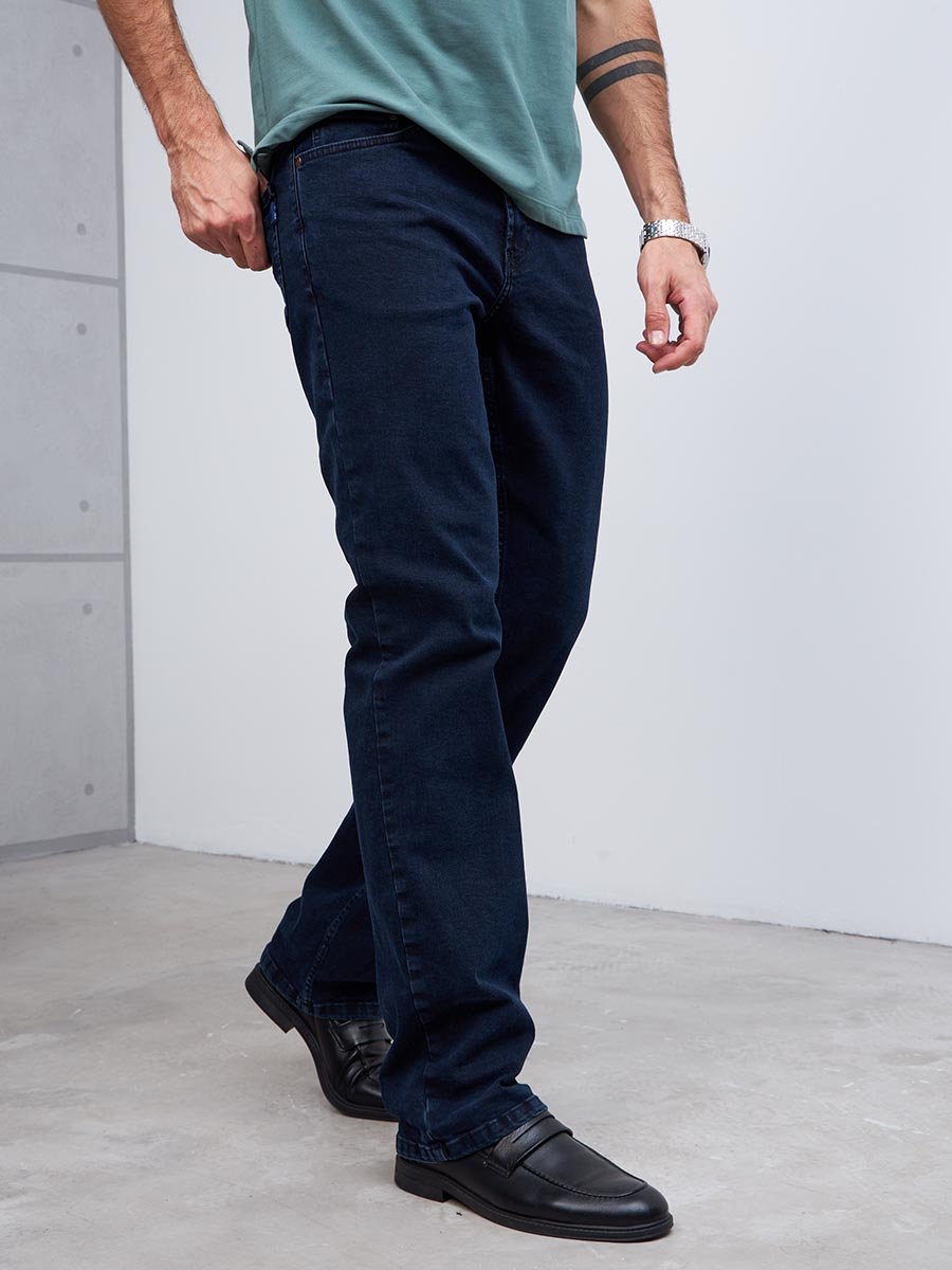 Мужские классические джинсы с пятью карманами. Посадка Regular fit (полуоблегающие по бедру), высокая талия, немного заужены к низу. Застежка на молнии. Выполнены из эластичной ткани denim stretch, цвет ткани Blue/Black (лицевая сторона ткани темно-синяя, изнаночная сторона- черная). Темная стирка со потёртостями только по швам.