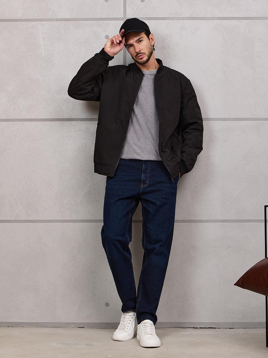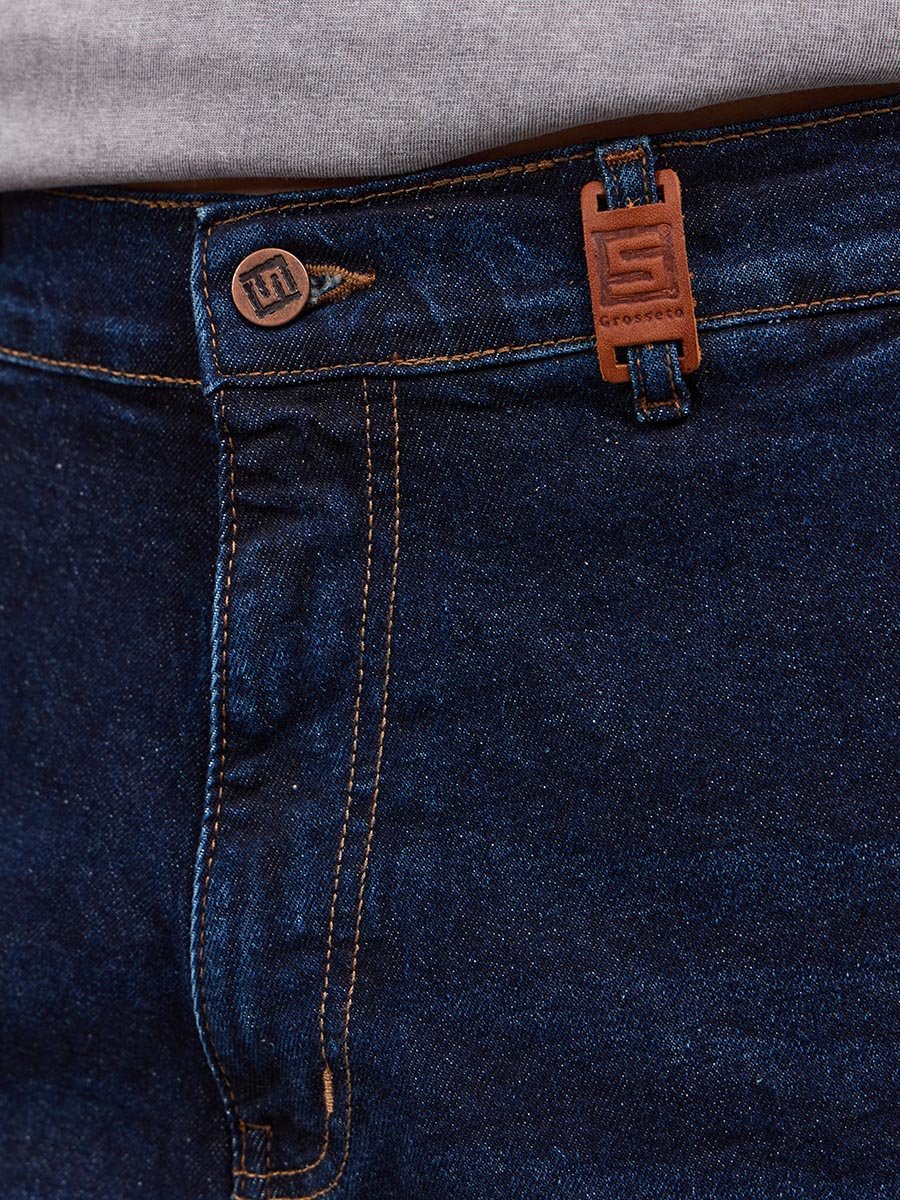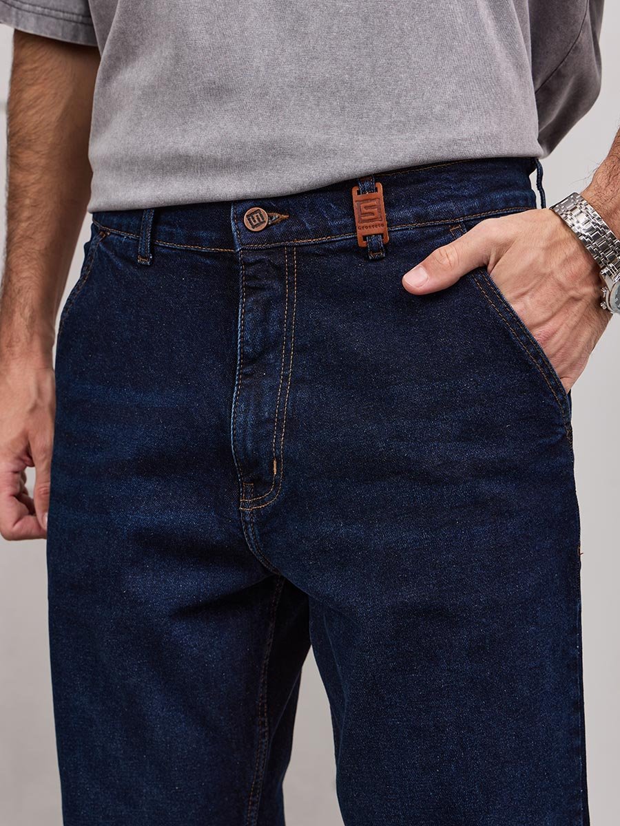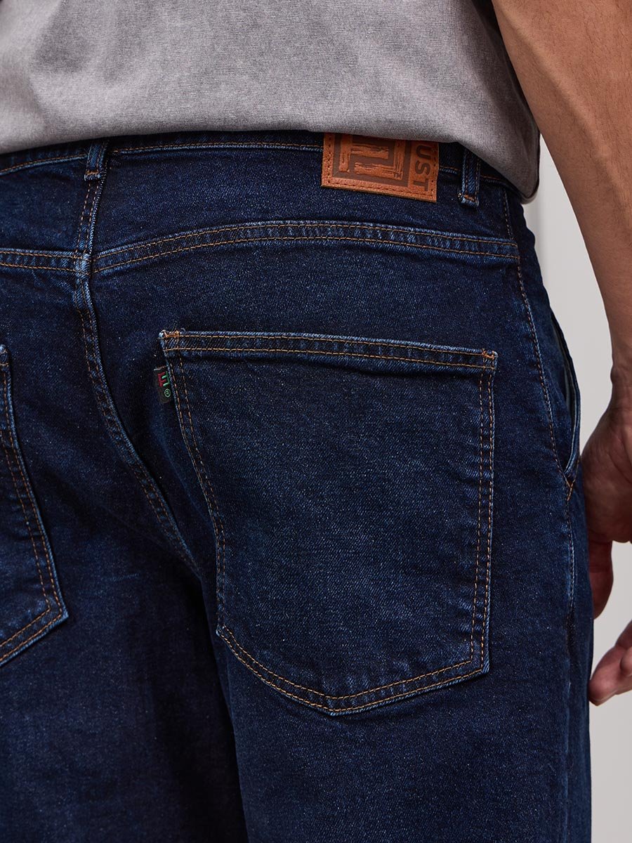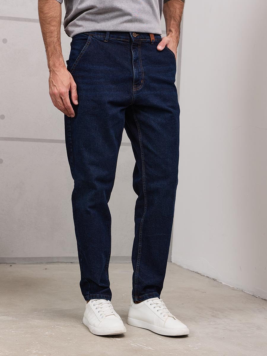 Мужские комфортные модные джинсы "Бананы" с пятью карманами.Для удобства боковые карманы джинсов сделаны косыми , т.е. карманы "хулиганы". Высокая талия, свободные по бедрам и бедру и узкие внизу. Застежка на молнии. Выполнены из слабоэластичной ткани denim comfort stretch. Классическая темная стирка "stone wash" со слабовыраженными потёртостями и "усами" спереди и потёртостями сзади.