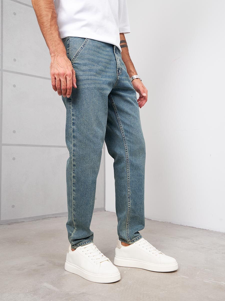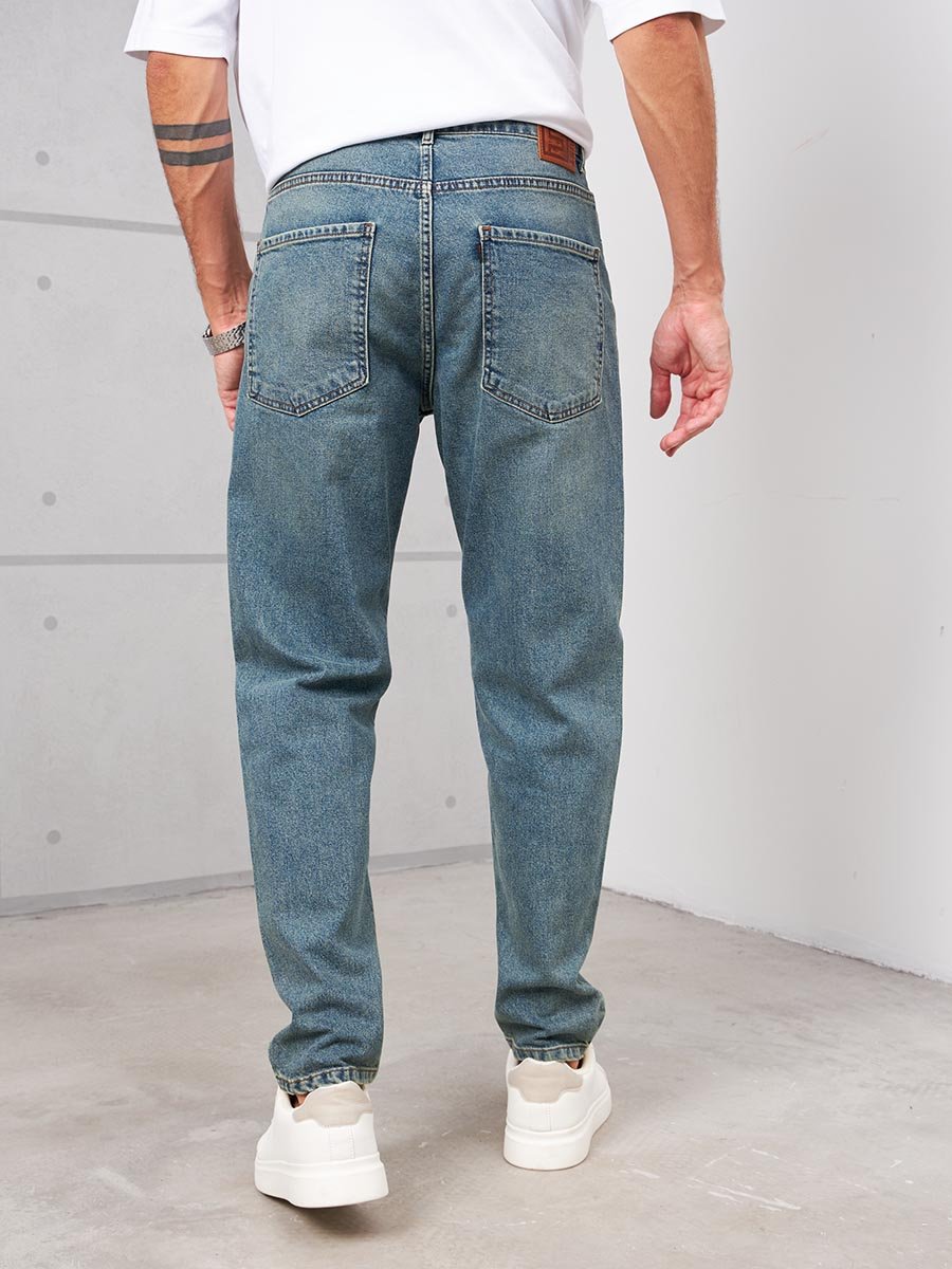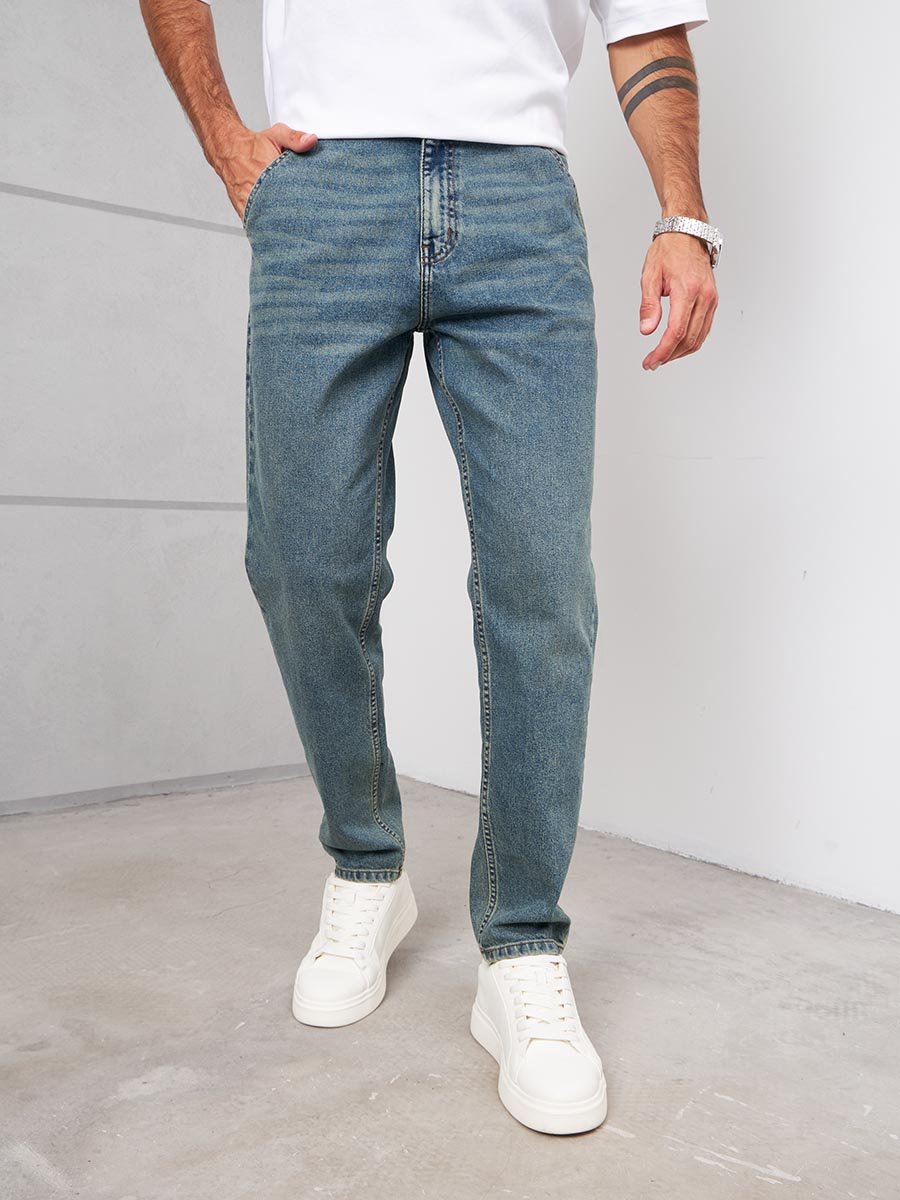 Мужские комфортные модные джинсы "Бананы" с пятью карманами.Для удобства боковые карманы джинсов сделаны косыми , т.е. карманы "хулиганы". Высокая талия, свободные по бедрам и бедру и узкие внизу. Застежка на молнии. Выполнены из классической ткани denim, Классическая средняя стирка "stone wash".Джинсы дополнительно чуть-чуть подкрашены в желтый цвет для получения эффекта "GET DIRTY", т.е. эффекта запачканных джинсов.