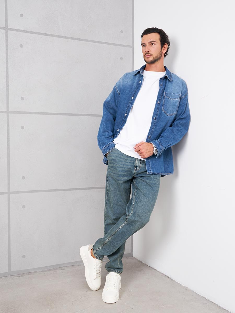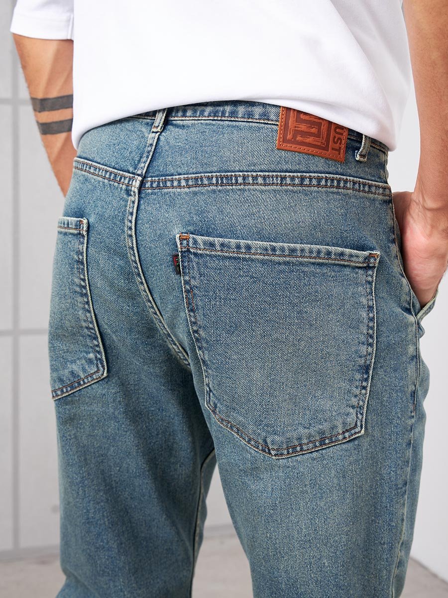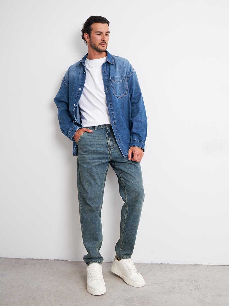 Мужские комфортные модные джинсы "Бананы" с пятью карманами.Для удобства боковые карманы джинсов сделаны косыми , т.е. карманы "хулиганы". Высокая талия, свободные по бедрам и бедру и узкие внизу. Застежка на молнии. Выполнены из классической ткани denim, Классическая средняя стирка "stone wash".Джинсы дополнительно чуть-чуть подкрашены в желтый цвет для получения эффекта "GET DIRTY", т.е. эффекта запачканных джинсов.