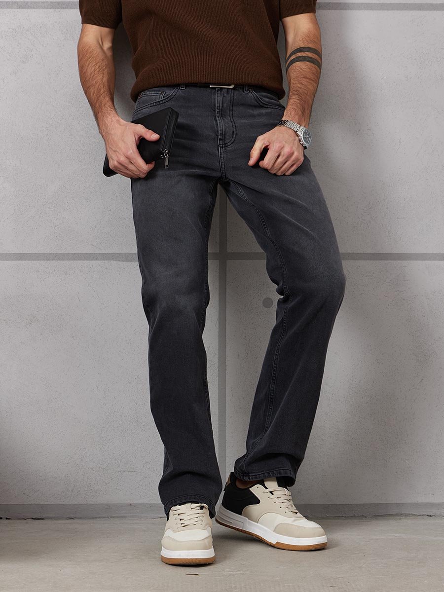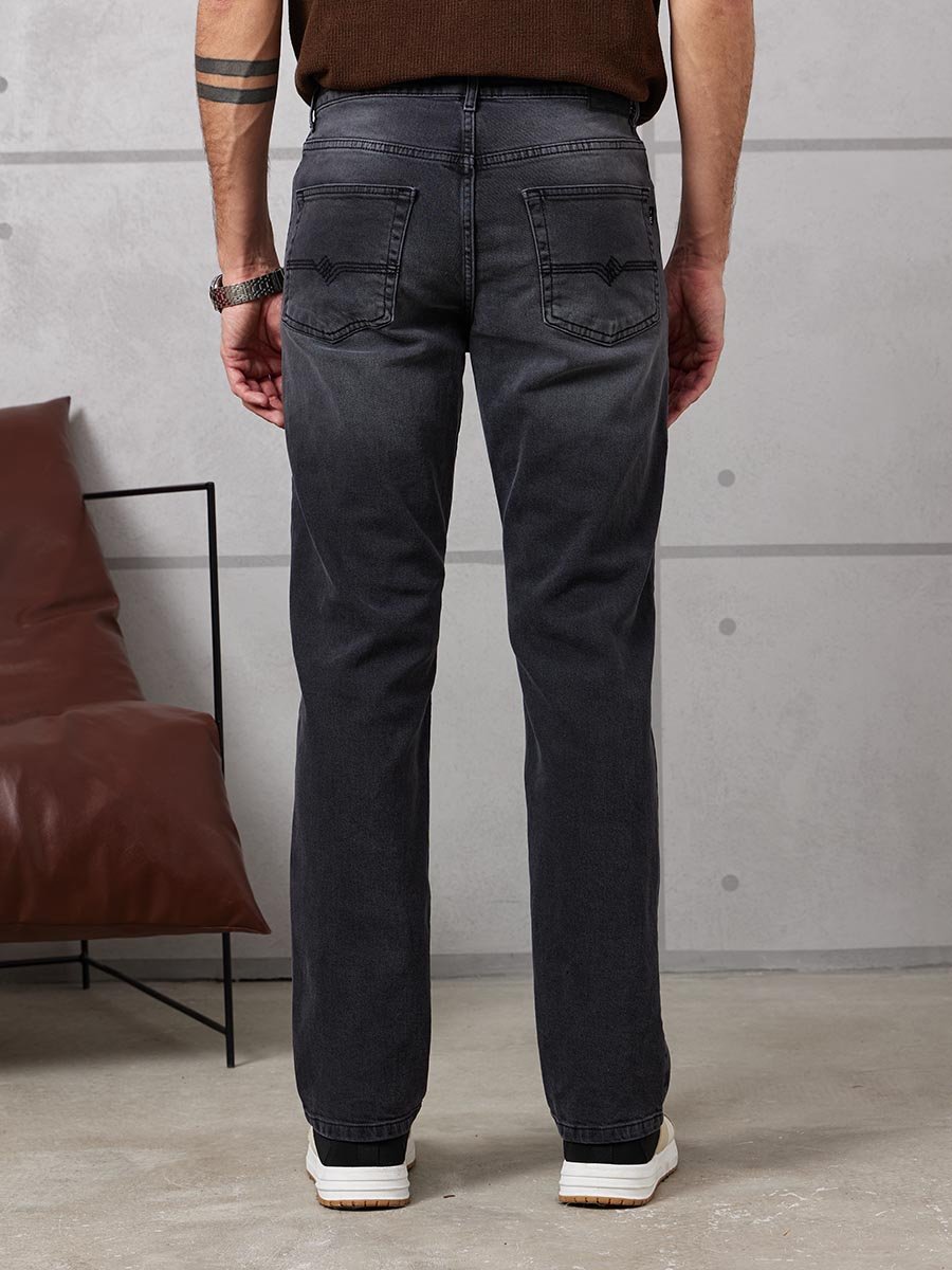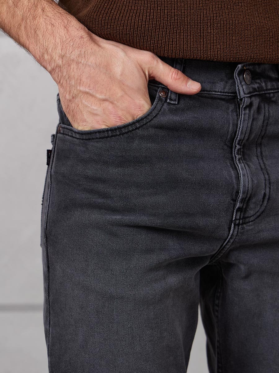 Мужские классические джинсы с пятью карманами. Посадка Regular fit (полуоблегающие по бедру), высокая талия, немного заужены к низу. Застежка на молнии. Выполнены из слабоэластичной ткани denim comfort stretch, цвет ткани Black/Black (лицевая и изнаночная стороны ткани черные). Темная стирка с потёртостями и "усами" спереди и потёртостями сзади.