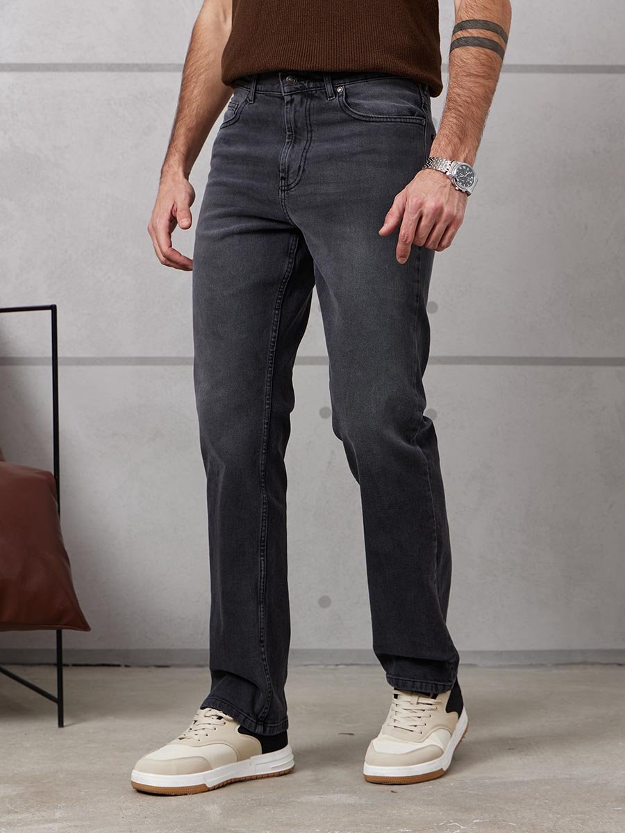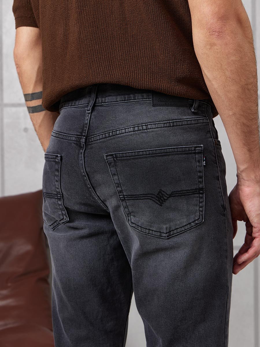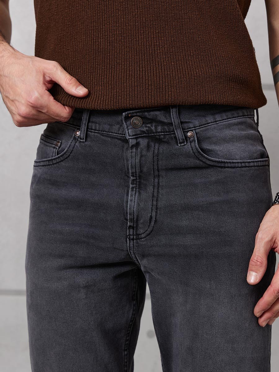 Мужские классические джинсы с пятью карманами. Посадка Regular fit (полуоблегающие по бедру), высокая талия, немного заужены к низу. Застежка на молнии. Выполнены из слабоэластичной ткани denim comfort stretch, цвет ткани Black/Black (лицевая и изнаночная стороны ткани черные). Темная стирка с потёртостями и "усами" спереди и потёртостями сзади.