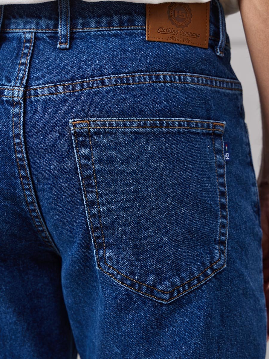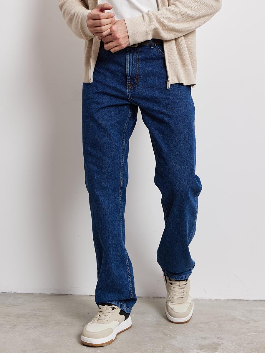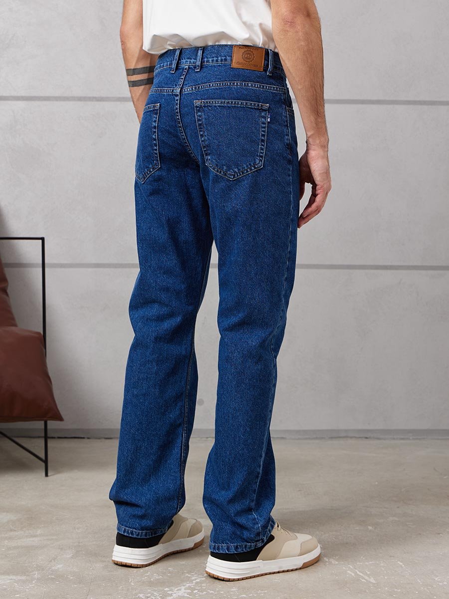 Мужские классические джинсы с пятью карманами. Посадка Comfort fit (свободные по бедру), высокая талия, широкие в колене и по низу. Застежка на молнии. Выполнены из традиционной хлопковой ткани denim. Темная стирка с камнями (stone wash).