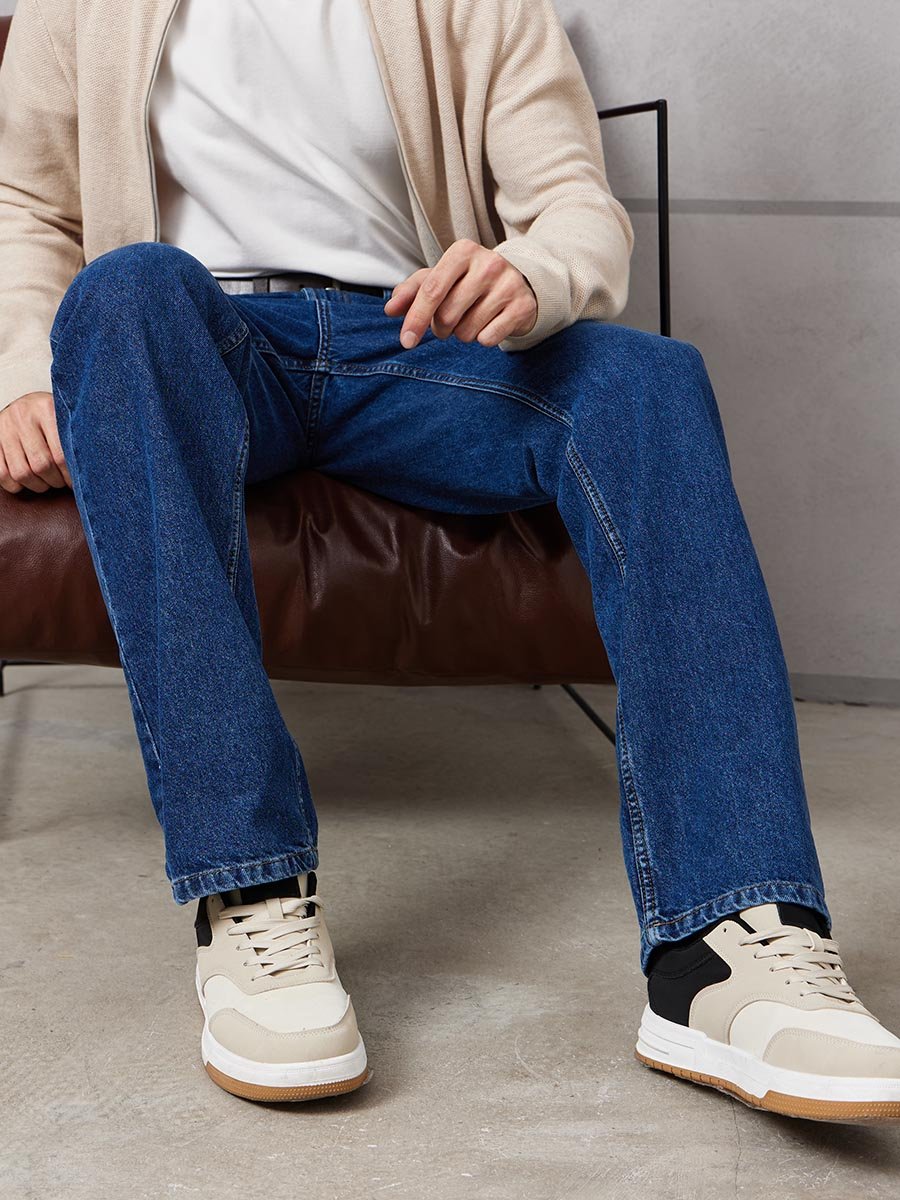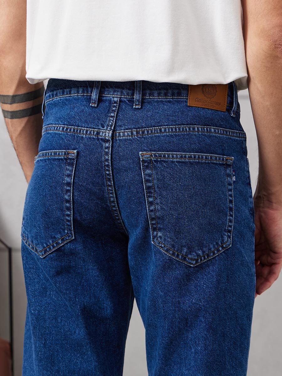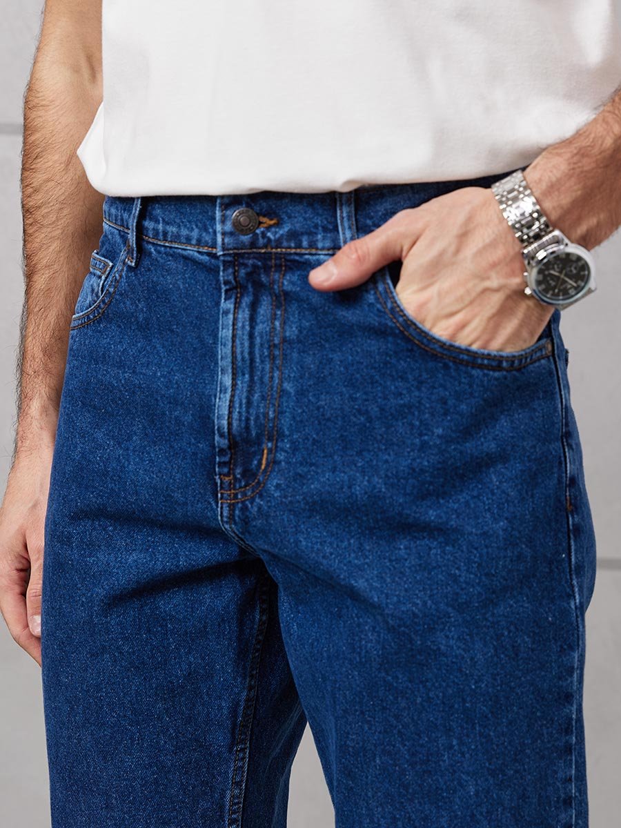 Мужские классические джинсы с пятью карманами. Посадка Comfort fit (свободные по бедру), высокая талия, широкие в колене и по низу. Застежка на молнии. Выполнены из традиционной хлопковой ткани denim. Темная стирка с камнями (stone wash).