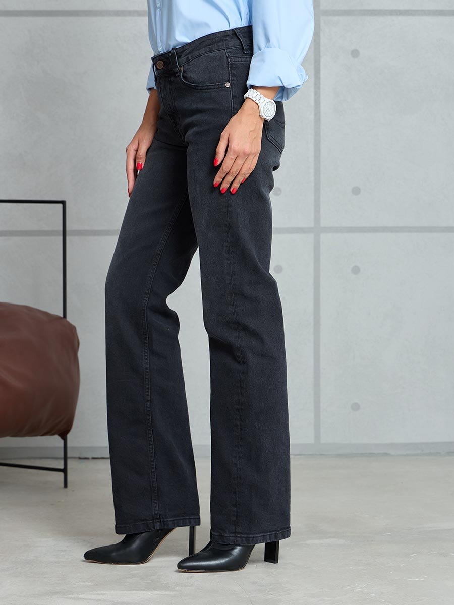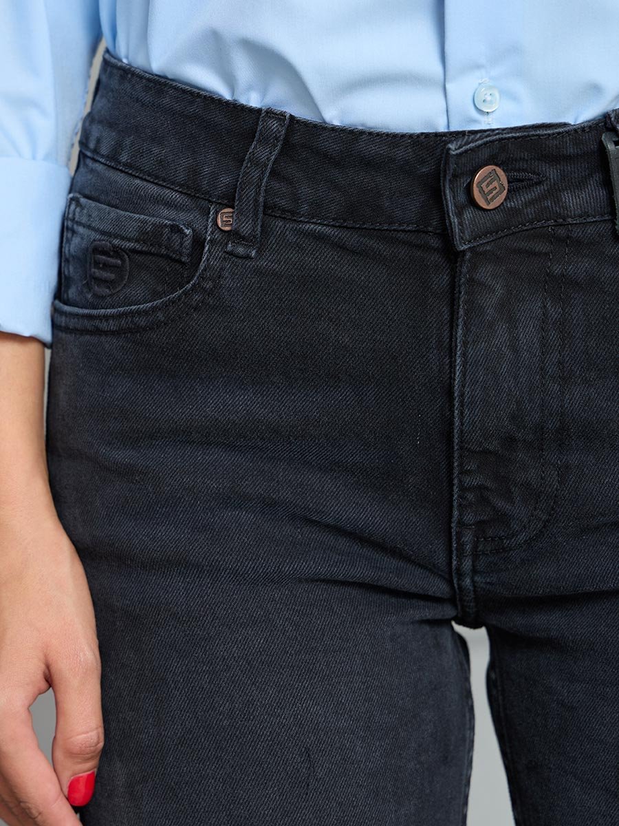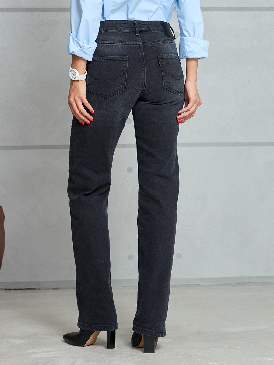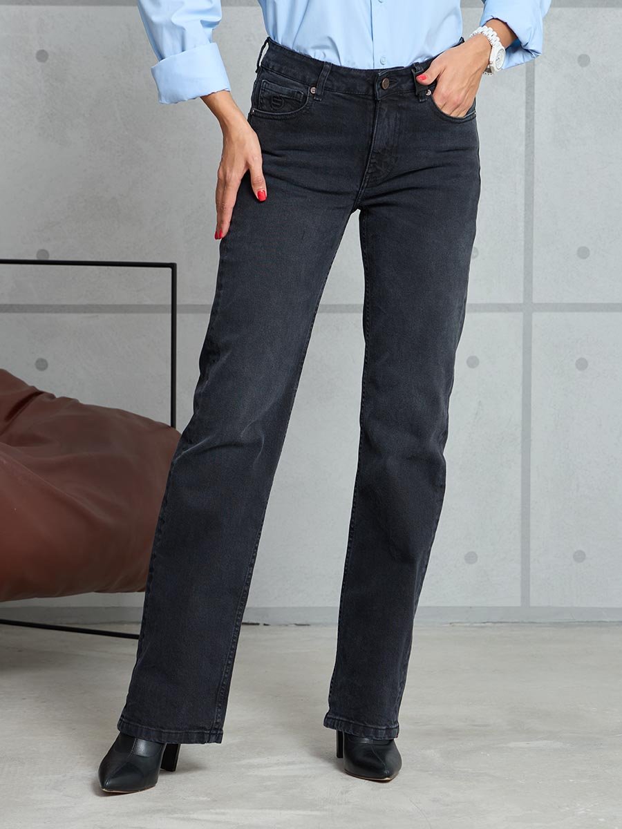 Женские джинсы с пятью карманами. Посадка Regular fit (полуоблегающие по бедру), средняя высота талии спереди и умеренно-высокая сзади, прямые по длине. Для улучшения посадки сделан подкройной пояс из 2-х частей. На часовом кармане вышивка. Застежка на молнии. Выполнены из слабоэластичной ткани denim comfort stretch, цвет ткани Black/Black (лицевая и изнаночная стороны ткани черные). Основной оттенок ткани после стирки черно-серый. Темная стирка со слабовыраженными потёртостями и "усами" спереди и потёртостями сзади.