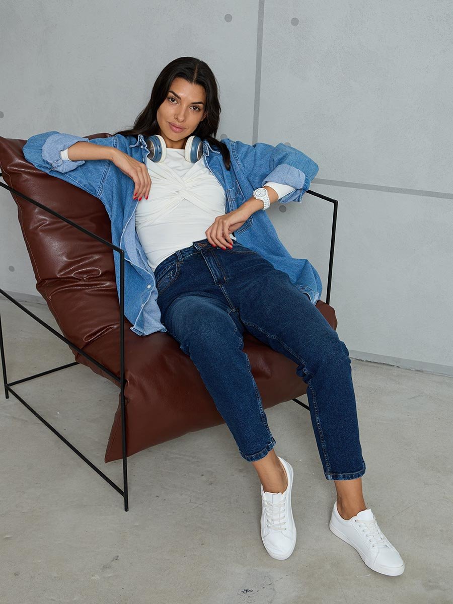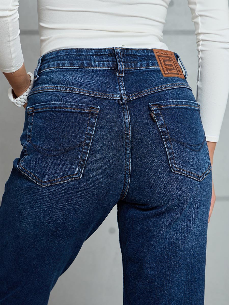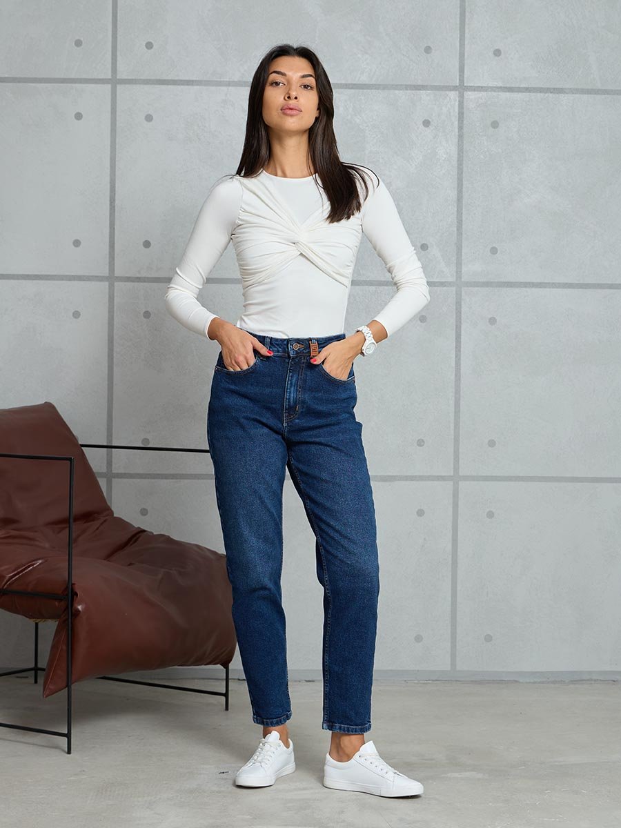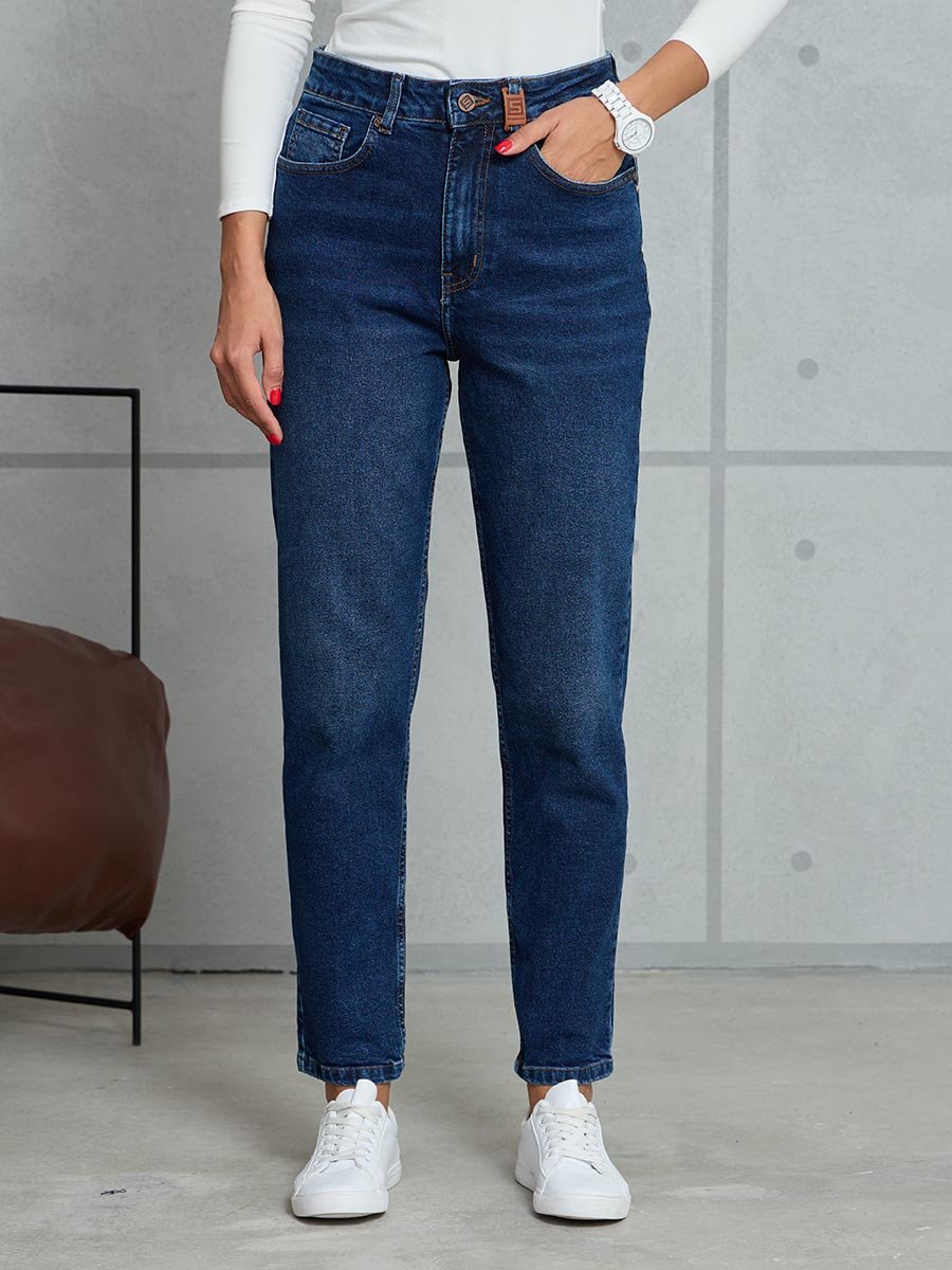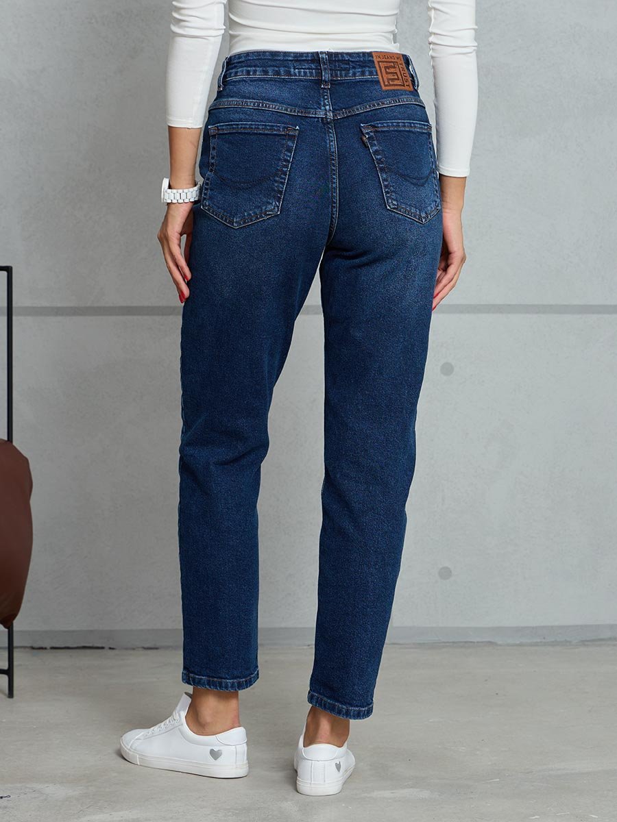 Женские ретро джинсы с пятью карманами. Посадка Mom fit (высокая талия), свободные в бедре и зауженные к низу, укороченной длины. Застежка на молнию. Выполнены из слабоэластичной ткани denim comfort stretch. Темная стирка с потёртостями и "усами" спереди и потёртостями сзади.