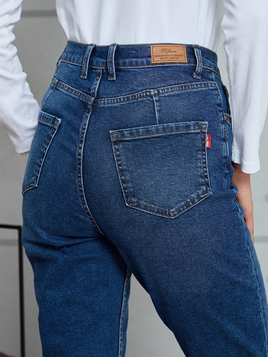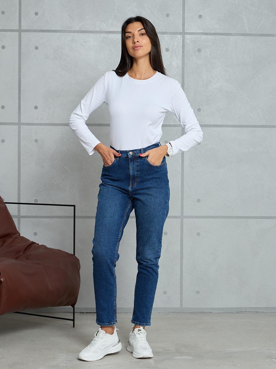 Женские классические ретро джинсы с пятью карманами с использованием лучших традиций 90-х. Посадка Mom fit, высокая талия спереди и сзади, свободные в бедре и зауженные к низу укороченной длины. Застежка на молнии. Выполнены из слабоэластичной ткани denim comfort stretch. Средняя стирка "stone wash" с потертостями спереди и сзади.