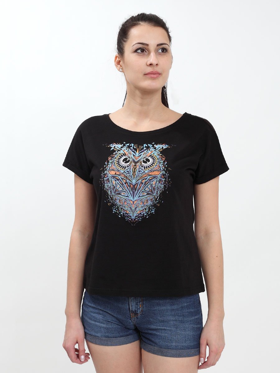 Женская футболка F5, Comfort fit (свободный силуэт), круглый вырез горловины, короткий цельнокроеный рукав с отворотами. Выполнена из классического трикотажного полотна.